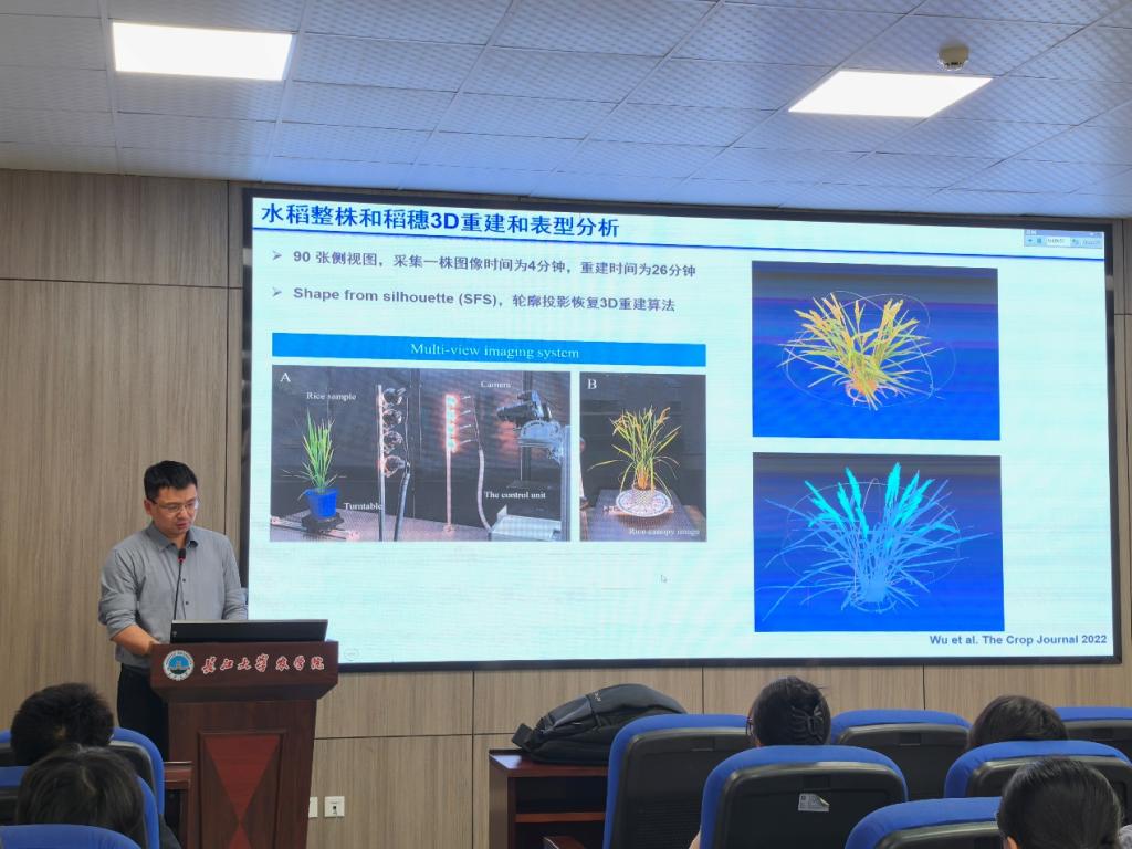 首先,杨万能教授为pp电子师生作题为“作物表型组学前沿技术研究与应用”的学术报告。在报告中,杨教授通过生动有趣的案例、通俗易懂的语言,详细介绍了其团队围绕作物性状表型数据“高通量、高质量、高效率”采集及分析目标,自主研发设备、编写程序的过程,同时分享了研发过程中遇到的技术瓶颈与创新解决思路;此外,还系统阐明了作物表型分析技术与基因组、代谢组等技术联合应用,进而挖掘作物关键功能基因的经典实践案例。报告结束后,杨教授与师生围绕“平台与传感器选择”“表型分析模型构建”等核心问题展开深入研讨,耐心解答师生疑问。此次报告有效开拓了师生学术视野,进一步激发了大家对农业信息技术、智慧农业等新兴领域的研究兴趣。