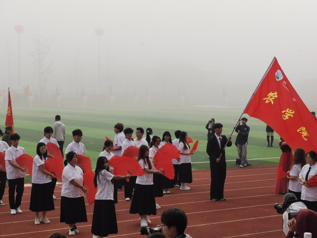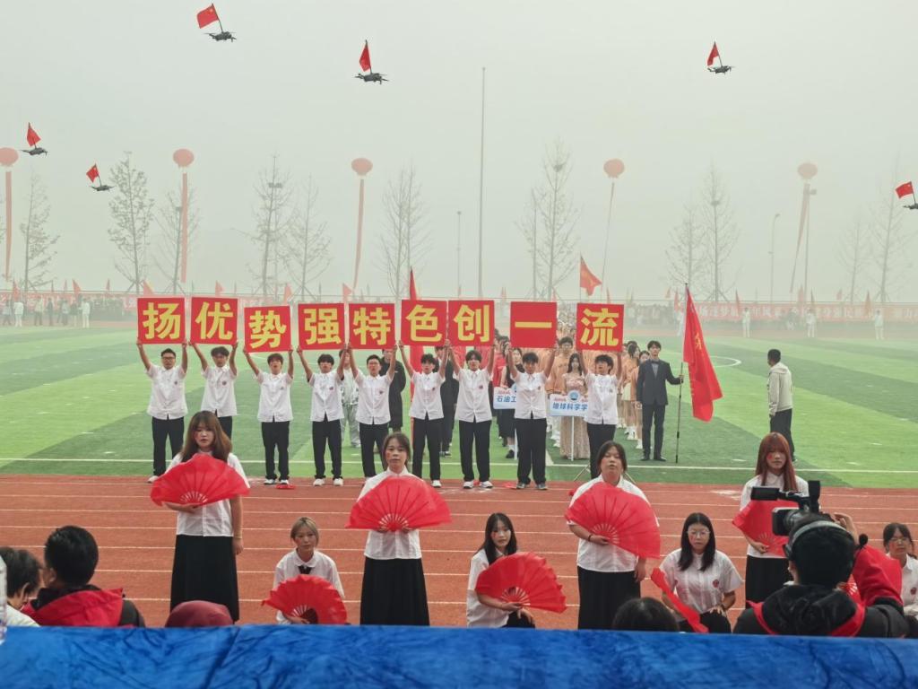 开幕式上,全校各学院(部)方阵依次登场,pp电子游戏官网方阵作为第五个出场队伍,一亮相便惊艳全场。数十架无人机托举着五星红旗在空中平稳巡航,编队灵活变换,与地面方阵形成呼应。随后,方阵同学手持折扇跳起精心编排的舞蹈,伴随配乐的欢快旋律,扇面开合间如金色麦浪翻滚。独特的创意、流畅的表演赢得全场师生雷鸣般的掌声,成为开幕式上最令人印象深刻的环节之一。