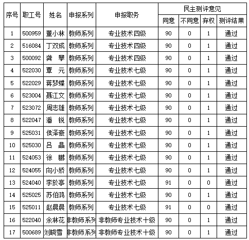2025年10月9日下午召开2025年度职称评审民主测评会议,参加测评人员应到130人,实到91人,同意票达61票为通过;2025年10月10日线上开展赵晨晨职称评审民主测评,参加测评人员应到130人,实到130人,同意票达87票为通过,具体测评结果见下表。根据学校有关要求,进行结果公示。