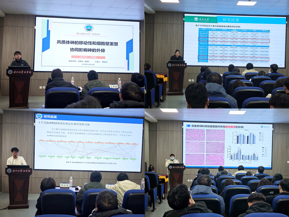 随后,四位来自不同学院的主讲人依次登台,分享前沿研究成果。pp电子游戏官网唐海洋深入剖析共质体砷移动性与细胞壁重塑的协同外排机制,为重金属污染农田的植物阻控提供了切实可行的策略,为土壤污染治理开辟新路径;园艺园林学院马佳伟对生姜SWEET基因家族展开鉴定与初步功能研究,明确糖转运与风味物质积累的内在关联,为香辛作物分子育种筑牢理论根基;动物科学技术学院明凯在低鱼粉饲料中添加蛋氨酸,系统评估青鱼生长、免疫、营养代谢及肌肉品质指标,为水产减抗养殖和鱼粉替代提供有力数据支撑,助力水产养殖业可持续发展;生命科学学院熊群艳构建机器学习模型,精准提取六堡茶挥发性谱图中的关键香气辨别因子,实现茶样香气快速分类,为茶叶品质鉴定和风味研究提供全新技术手段。
