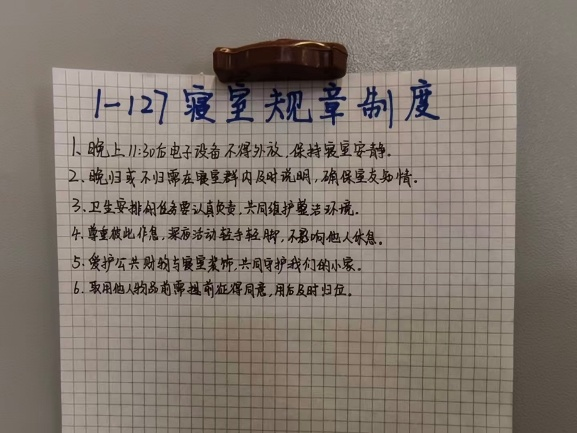 127的整洁有序,源于四人对“小家”的珍视,更源于心底的善良与体谅。那张手写的《1-127寝室规章制度》,不是冰冷的条款,而是彼此尊重的郑重约定。从深夜电子设备静音,到晚归及时报备;从认真完成卫生任务,到取用物品先征同意,每一条规则的背后,都是为他人着想的善良。正是这份共情与包容,让寝室始终保持着整洁温馨的氛围,成为她们安心栖居、潜心成长的港湾。