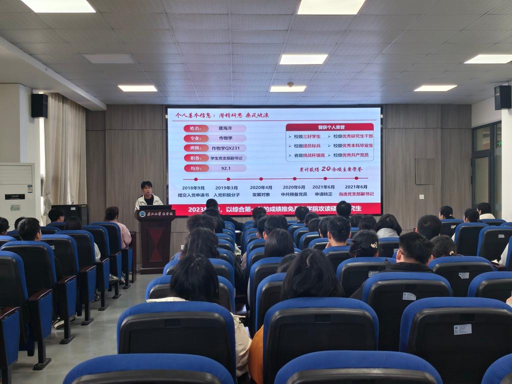 (通讯员 郑怡乐/文 郝梨/摄)党建领航研途路,先锋传薪启新程。为深入学习贯彻党的二十大精神,夯实研究生党支部战斗堡垒作用,11月12日中午,pp电子游戏官网举行“一院一品”研究生党员学术经验分享活动。特邀学院3名研究生国家奖学金获得者:唐海洋、文泳、赵希梅作为主讲人为全体研究生党员和入党积极分子分享学术经验。