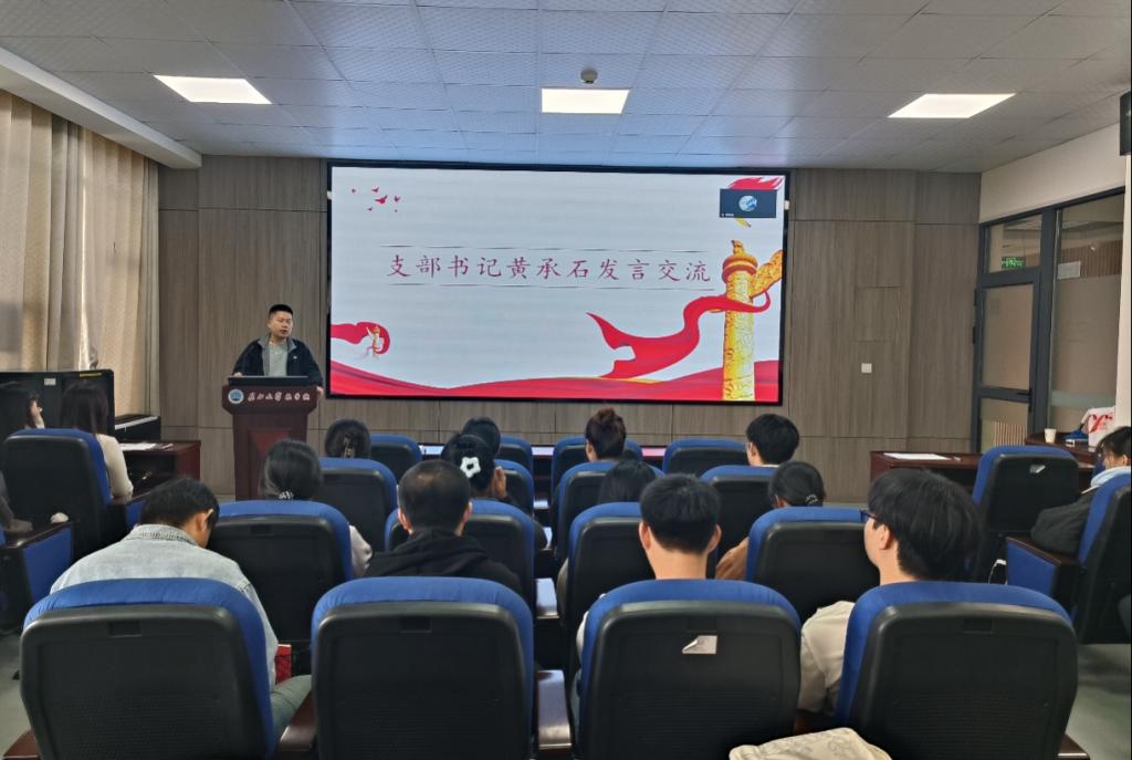 第四项,全体党员面向党旗,重温入党誓词。党支部书记黄承石老师宣读大会决议并作总结,他向成功转正的同志致以祝贺,并勉励全体党员恪守入党誓词、永葆党员本色,坚持在“学思践悟”中筑牢信仰之基,在“奋发有为”中践行初心使命,切实将其内化于心、外化于行。
