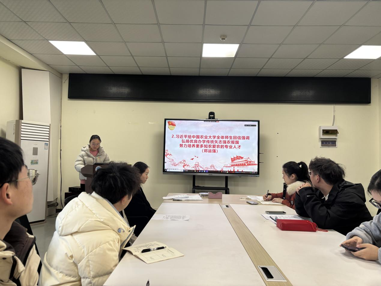 党员袁琨航以“学习‘十五五’规划精神,践行新征程使命”为主题开展微党课,通过解读习近平总书记在《求是》杂志发表的重要文章,引导党员认真把握“十五五”规划的核心要义。党员郑运强同志领学了习近平总书记给中国农业大学全体师生回信,强调弘扬优良办学传统矢志强农报国,努力培养更多知农爱农的专业人才的重要内容。