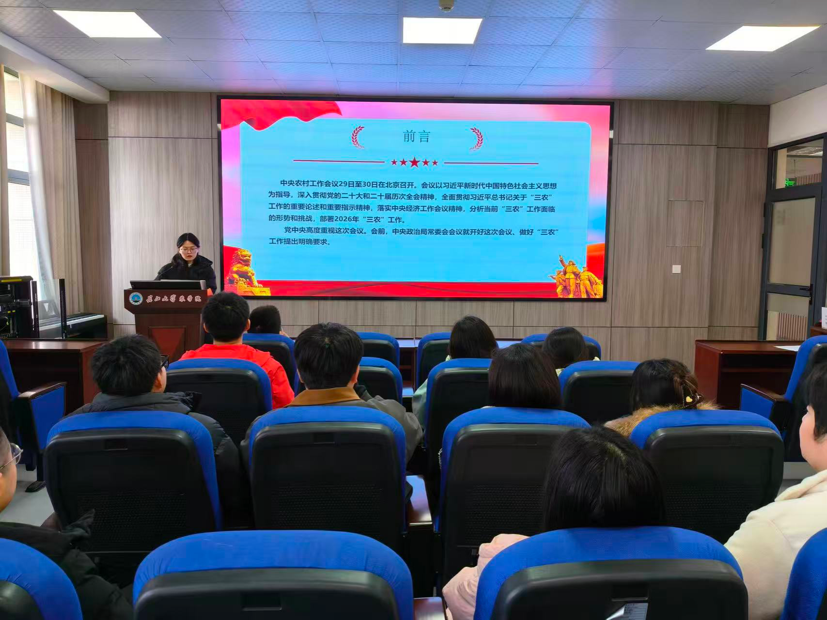 曾恺怡同志结合学习贯彻党的二十届四中全会精神和传达学习12月29日至30日在北京召开的中央农村工作会议精神,开展了一堂生动的微党课。2026年作为“十五五”开局之年,中央农村工作会议为“三农”工作指明方向,会议提出的粮食安全、农业新质生产力等要求,与专业高度契合。身为农科学子,党员们深感“强国必先强农,农强方能国强”的分量,矢志深耕专业、精进技能,力争把所学知识转化为助农实效,用实际行动为农业现代化建设添砖加瓦。