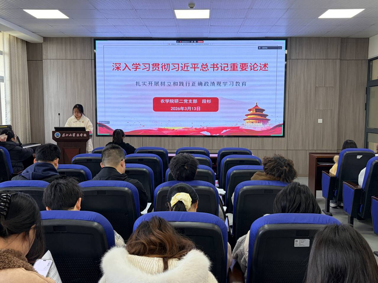 最后,支部书记付雪娇作总结讲话。她指出,本次主题党日活动主题鲜明、内容扎实,通过重温入党誓词、微党课讲授、集中理论学习与交流研讨,勉励青年党员,要以此次学习为新起点,自觉践行正确政绩观,把“论文写在大地上”,将理论学习成果转化为扎根农业科研、服务“三农”事业、助力乡村振兴的实际行动,在强国建设、民族复兴的征程中展现农科学子的担当作为。