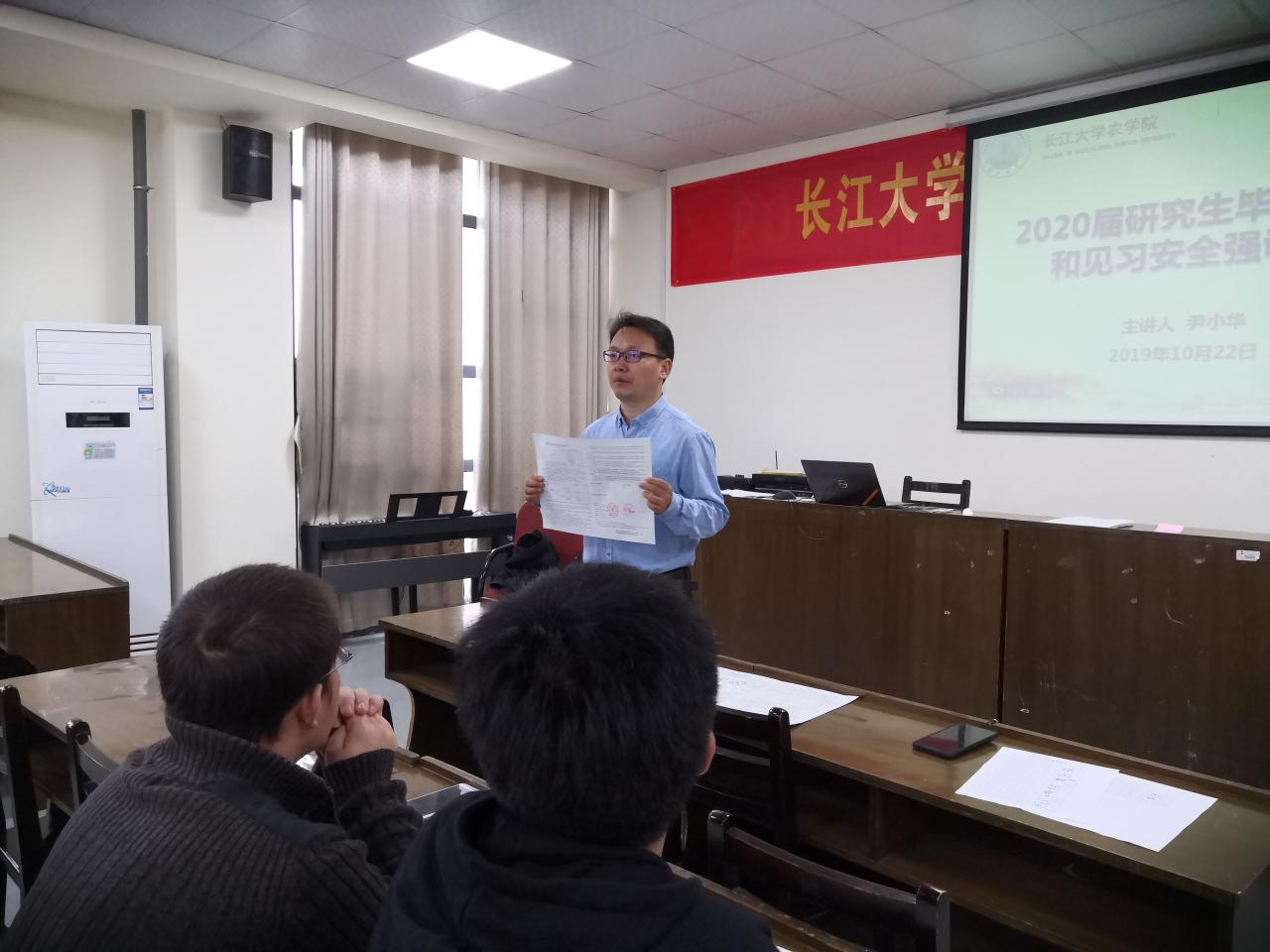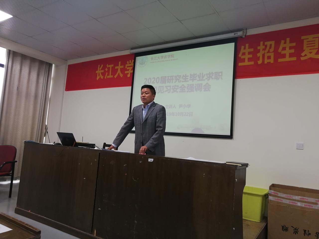 紧接着,团委书记尹小华老师为毕业生们讲解就业协议的签订,他强调了与企业签约对保护同学们合法权益的重要性,提醒大家警惕各种求职陷阱。同时,尹老师介绍了本月25号即将在我校举办的2020届农科类专场招聘会,鼓励大家携带简历积极参与,多了解,多尝试,在不同的面试中积累和总结经验。他还为考博的同学们送上嘱咐,希望大家坚定信心,为向更高的平台冲刺而不懈努力。