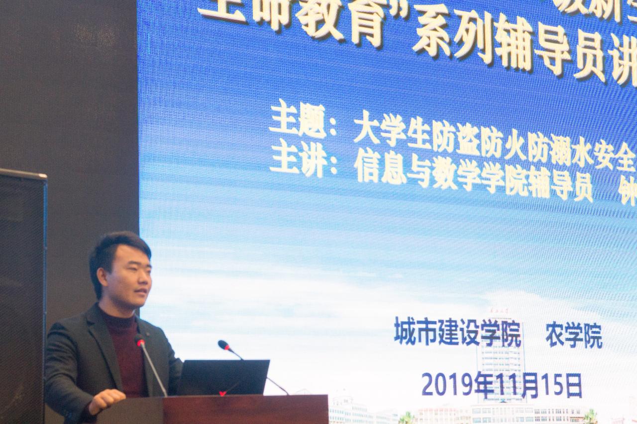 通讯社讯(见习记者 汤莉/文 聂子龙/摄)珍爱生命,注意安全;教育第一,预防为主。继11月6日pp电子游戏官网2019级新生首次“生命教育”辅导员讲座开讲后,11月15日晚7点整,第二场“生命教育”辅导员讲座在农科大楼1058报告厅如期举行。本次讲座邀请信息与数学学院辅导员钟赛和城市建设学院辅导员何儒权分别讲解了“大学生防盗防火防溺水”和“网络与国家公共安全”,pp电子游戏官网辅导员付雪娇及19级全体新生参加了本次大会。
