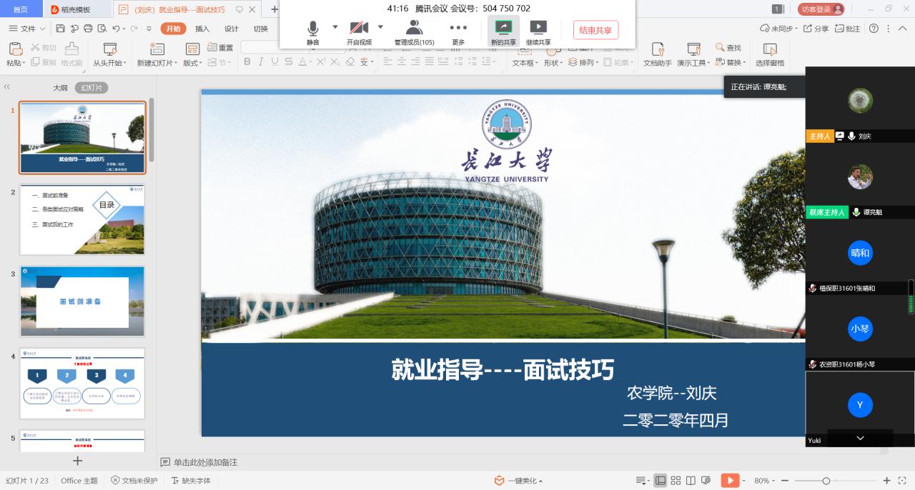 为打赢疫情防控攻坚战,更好地为毕业生提供就业指导服务,帮助解决学生在求职面试时面临的疑难困惑,提升学生求职面试应对能力。4月3日19:00,pp电子游戏官网利用“腾讯会议”平台开展面试技巧辅导报告会。报告会由学院党委副书记谭亮魁主持,学院就业专干刘庆老师主讲。学院100多名毕业生参加了报告会。