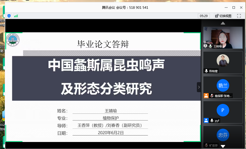 各答辩组长首先介绍答辩流程、答辩顺序、注意事项。答辩正式开始之后,答辩学生依次通过“腾讯会议”共享屏幕汇报毕业论文内容;答辩委员结合学生毕业论文及汇报情况,指出论文存在的问题与不足,质疑提问,答辩学生则在线回答评委老师们提出的问题,答辩秘书按要求做好答辩记录。