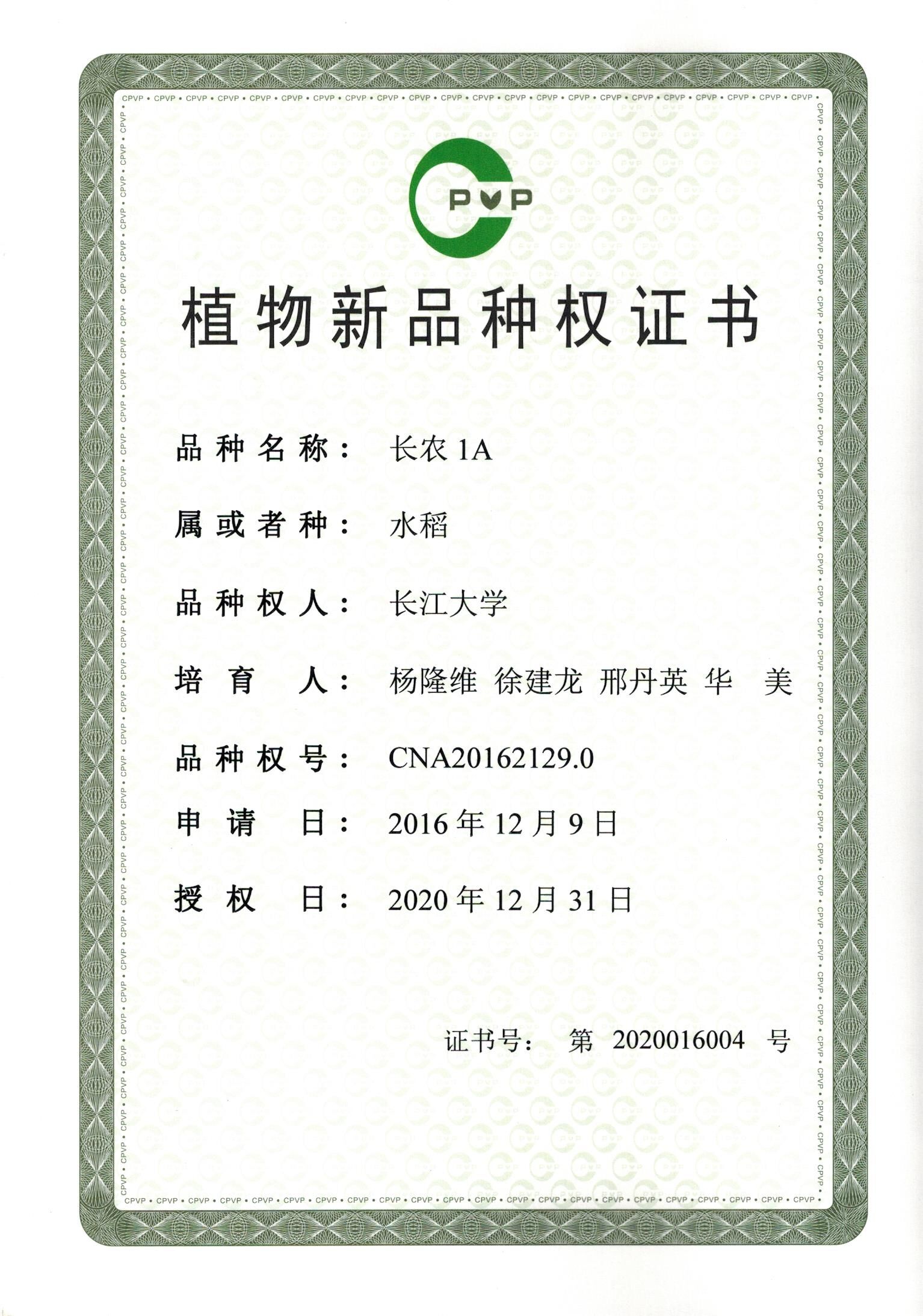 (通讯员 谭亮魁)3月29日,pp电子游戏官网收到一份植物新品种保护权证书,pp电子游戏官网育成的三系杂交水稻新不育系长农1A正式获批农业部植物新品种保护权,品种权号为:CNA20162129.0。该不育系培育人为pp电子游戏官网杨隆维教授、长大学者徐建龙特聘教授和邢丹英教授等。
