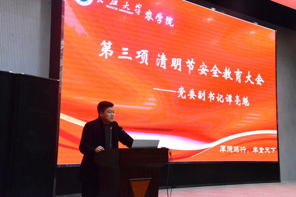 大会最后,党委副书记谭亮魁就清明节放假安全问题讲话,告诉同学们要注意清明节假期期间的自身安全,在疫情未根除的情况下,告诫学生们无特殊情况尽量不要到处游走,以免给疫情防控工作造成麻烦。如需特殊情况需要回家,也需要按程序向辅导员请假,经批准后才可离校。