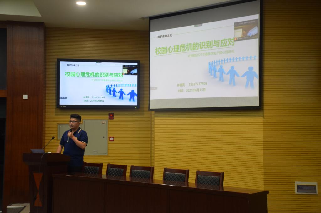通讯社讯(见习记者 张红霞/文 刘思慧/摄)为切实做好春季学期的学生心理健康教育工作,落实常态化疫情防控形势下的心理适应与行为引领要求,提升学生骨干自助与助人的水平,6月15日晚上7点,pp电子在农科大楼1056开展《校园心理危机的识别与应对》学生干部心理健康培训,心理专干老师林香亮主讲。