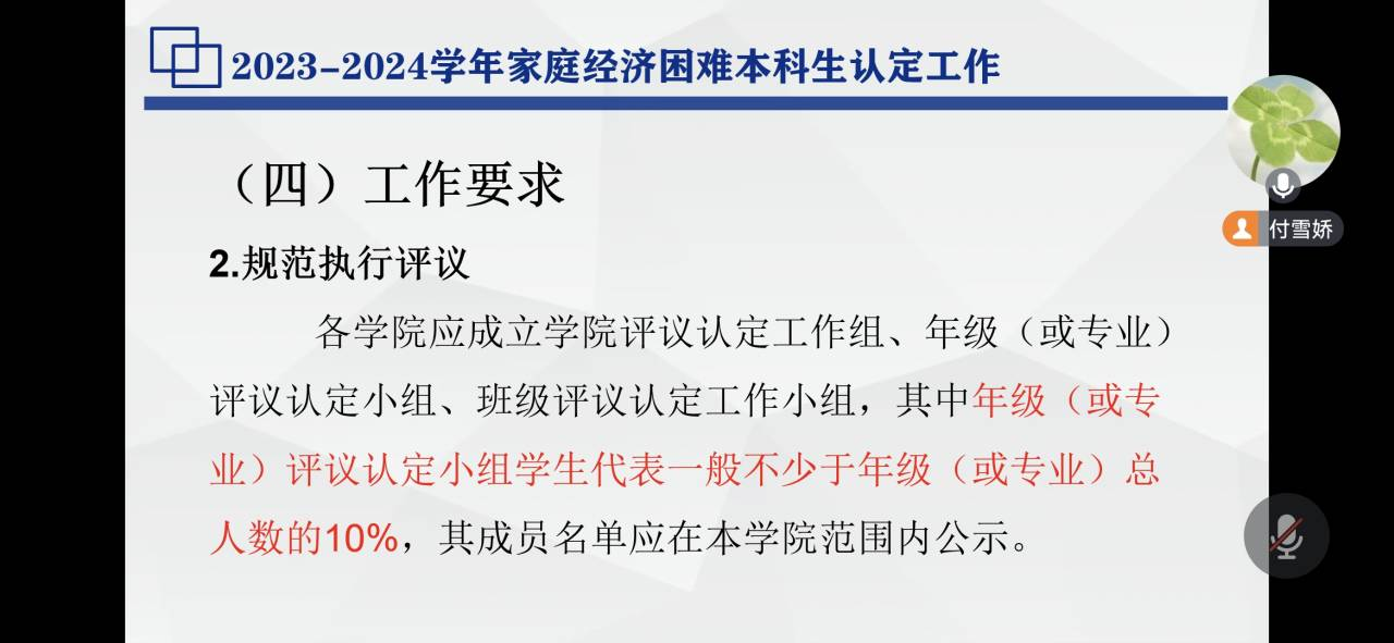 (通讯员 曾恺怡)为做好pp电子普通家庭经济困难学生认定工作,全面落实资助政策,做到有效资助,确保家庭经济困难学生能顺利入库,近日,pp电子召开了家庭经济困难本科生认定工作政策宣讲会。会议分为学院政策宣讲会和班级宣讲会,结合线上和线下的方式开展,党委副书记尹小华、资助专干付雪娇、全体班主任及全体班委参加此次会议。会议由付雪娇老师主持。