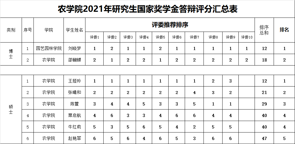 根据《pp电子游戏官网关于开展2021年研究生国家奖学金评审工作的通知》和《pp电子游戏官网2021年研究生国家奖学金评审实施细则》相关要求,经个人申请、一级学科点评审委员会初审、学生答辩、一级学科点评审委员会评审、学院审批等程序,拟推荐刘晓梦等2人为2021年作物学一级学科博士点博士研究生国家奖学金获奖人选;经个人申请、学院研究生国家奖学金评审委员会初审、学生答辩、学院研究生国家奖学金评审委员会评审、学院审核等程序,拟推荐王娅玲等6人为pp电子游戏官网2021年硕士研究生国家奖学金获奖人选,现将获奖名单进行公示,公示期为2021年10月18日—2021年10月22日。公示期内,如有异议可向学院纪检委员反映。
