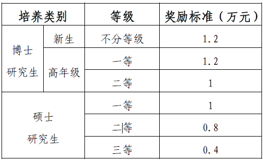 学校根据上级财政拨款、学费收入、社会捐助等情况确定研究生学业奖学金的类型等级、奖励标准和覆盖面,奖励比例实行动态调整。其中,博士学业奖学金和硕士新生学业奖学金覆盖面为100%。研究生学业奖学金具体等级和奖励标准如下: